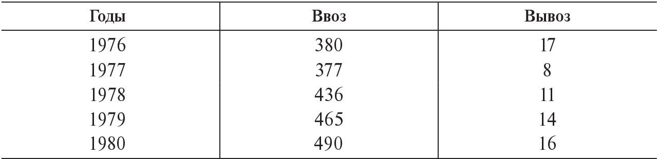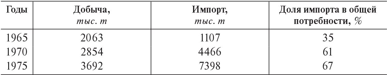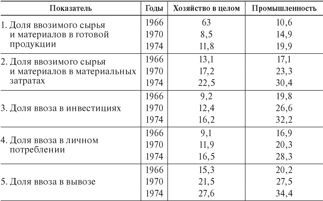 Доля энергетики в совокупном дефиците торгового баланса за этот период выросла от 10 до 27%. Рост производства продукции из импортируемых узлов составил в 1965–1970 гг. 270%, а в 1971–1977 гг. – 300 %. В большинстве случаев производство продукции из готовых узлов оговаривалось иностранными экспортерами такими условиями, которые препятствовали использованию отечественных материалов и полуфабрикатов.