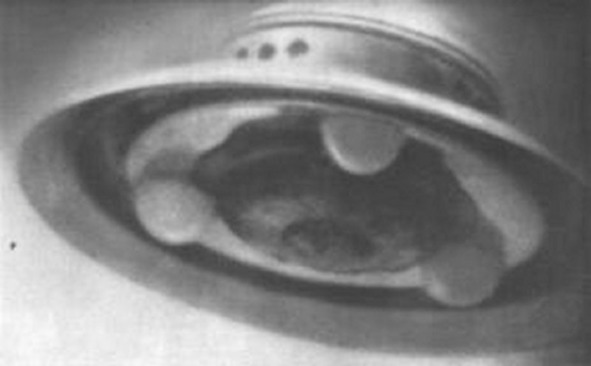 Для того чтобы разобраться в этом, необходимо совершить небольшое путешествие во времени, а конкретно в 1952 год. 13 декабря того года «венерианский разведывательный корабль» посетил Джорджа Адамски, польского эмигранта. Адамски, прославившийся своими контактами с «венерианцами», описанными в его книгах, имевших огромный успех у публики, успел сделать в телескоп несколько снимков. На снимке мы видим нечто вроде перевернутого блюдца с тремя шарами внизу, очевидно, шасси для посадки. Наверху круглая кабина с иллюминаторами.