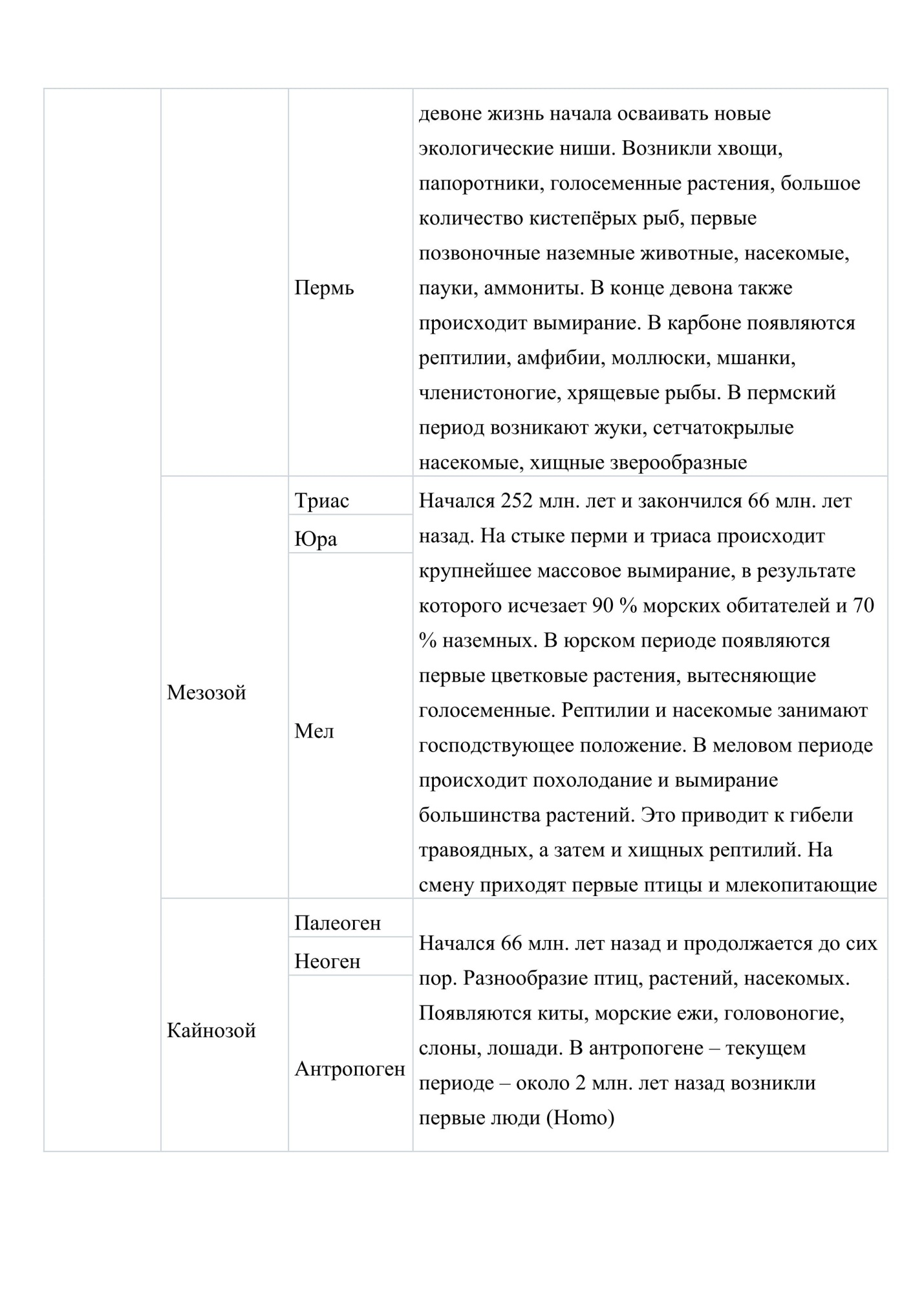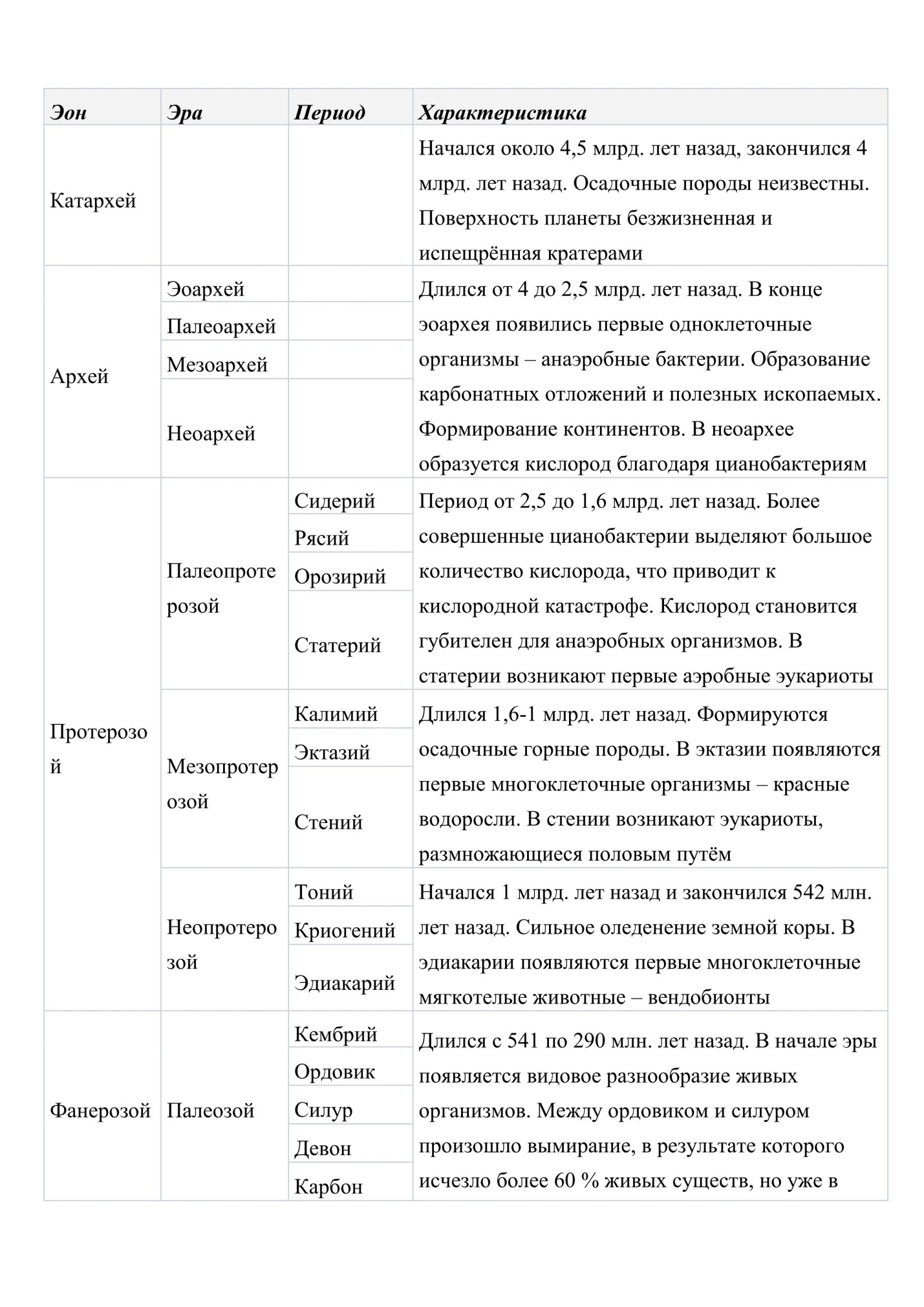 Солнечная система с её планетами образовалась из газопылевого облака 4,6 миллиардов лет назад. Сначала образовались под действием сил гравитации протопланеты, где ещё не было атмосферы, морей, воды. За тем из за пара и газов, вырывавшихся из недр планеты под действием гравитации образовалась плотная атмосфера (появилось небо), появились моря и океаны и суша. 3,8 миллиардов лет назад в океане зародилась жизнь. Появились простейшие водоросли. Жизнь на Земле условно поделена на геологические эры, которые объединены в эоны. Эон – это крупный отрезок геологической истории, объединяющий несколько эр. В свою очередь эры подразделяются на периоды. Для каждой эры характерно индивидуальное развитие животного и растительного мира, которое часто зависело от климата, состояния земной коры, подземной деятельности.