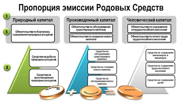 Установление объективной пропорции эмиссии Родовых Средств и направление их на проекты собственника капитала, обеспечившего эмиссию для создания прироста нового капитала.