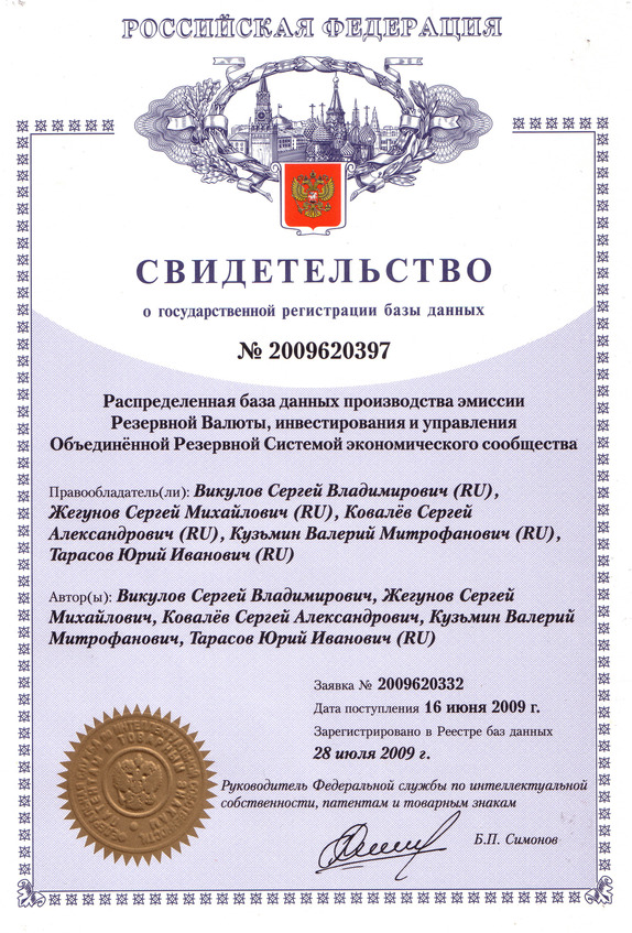 «Распределенная база данных производства эмиссии Резервной Валюты, инвестирования и управления Объединённой Резервной Системой экономического сообщества» (Свидетельство о государственной регистрации №2009620397 от 28 июля 2009 года)