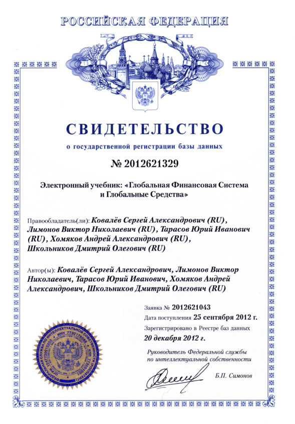 Группой авторов и правообладателей в составе: Викулов С. В., Жегунов С. М., Ковалёв С. А., Кузьмин В. М., Лимонов В. Н., Тарасов Ю. И., Хомяков А. А., Школьников Д. О. созданы и зарегистрированы в РОСПАТЕНТе: «Распределенная база данных производства эмиссии Резервной Валюты, инвестирования и управления Объединённой Резервной Системой экономического сообщества» (Свидетельство о государственной регистрации №2009620397 от 28 июля 2009 года) и Электронный учебник: «Глобальная Финансовая Система и Глобальные Средства» (Свидетельство о государственной регистрации №2012621329 от 20 Декабря 2012 года).