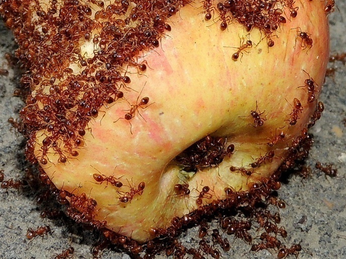 Или представьте, как муравьи покрывают обронённое яблоко своими телами.