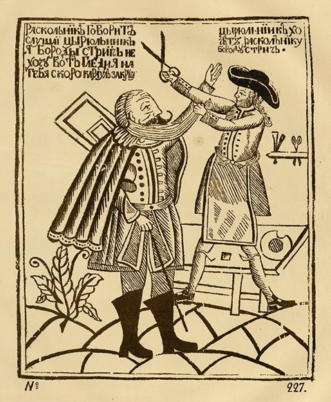 Петровские реформы были радикальны во всем, в том числе и в топонимике. Цирюльник стрижет раскольника (русский лубок). Д. А. Ровинский. Русские народные картинки. Атлас. Т. I, л. 227. Санкт-Петербург, 1881