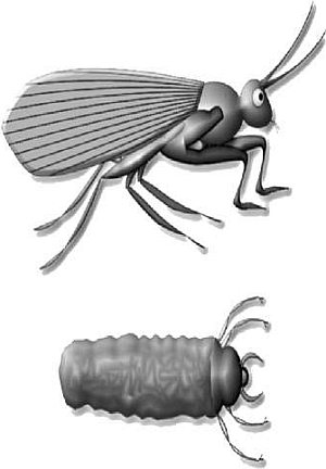 Ручейники. В нашем регионе именно ручейники занимают основное место в пищевом рационе рыб. Их жизненный цикл включает в себя следующие стадии развития: яйцо, нимфа, куколка, имаго (рис. 1).