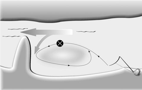 Рис. 1. Облавливается участок отмели, образованный перед мысом. Обозначено место приостановки проводки
