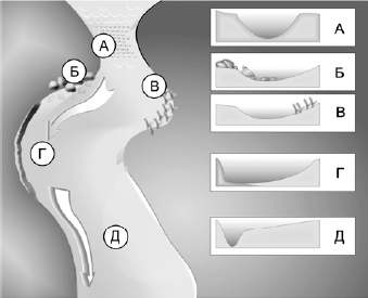 а– узкий проток; б– валуны на дне; в – участок, покрытый растительностью; г – подмоины у глинистого берега; д – глубокий проток на широком и мелком участке реки