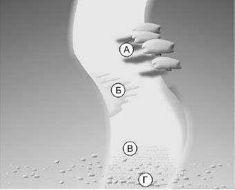 В конце перекатов с хрящеватым дном (мелкая галька с глиной) всегда находится обрыв с отмели на глубину, где можно встретить практически любую рыбу в течение суток (рис. 3, г).