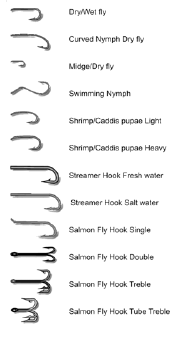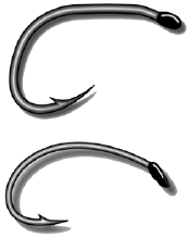 С развитием ловли нахлыстом стали изготавливаться крючки, по форме соответствующие тем насекомым, имитацию которых на них вязали, а в настоящее время для искусственных мушек выпускаются специальные рыболовные крючки (fly hook) (рис. 31). Они могут отличаться друг от друга и по весу, и по форме, и, конечно же, по размеру. Существуют изогнутые крючки для вязки имитаций поднимающихся нимф (rising или swimming nymph). Специально выпускаются с-образные крючки для вязки имитаций бокоплава, личинок ручейника (shrimp, klinkhamer, grub, sedge). К слову, с этой же целью можно применять и похожие по форме карповые крючки (рис. 32). Существуют модели с горизонтально ориентированным колечком (в нахлыстовой ловле употребляются редко), а также с колечком, направленным вниз (их большинство) и вверх. Бывают укороченные (short) и удлиненные стримеровые (long) крючки. Также выпускаются специальные лососевые крючки, которые в свою очередь делятся на легкие (low water salmon fly hook) и тяжелые (deep water salmon fly hook). В общем-то все они соответственно маркируются, и даже начинающий нахлыстовик при желании легко в этом разбирается. Вопросы иногда возникают при выборе крючков с удлиненным и укороченным цевьем.
