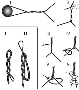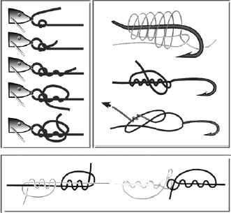 Любой узел, в зависимости от его вида, ослабляет снасть. В целом это имеет и свою положительную сторону, так как в случае глухого зацепа леска рвется не по всей длине, а в наиболее слабом месте. Однако лучше потерять поводок с крючком, нежели всю оснастку при матчевой ловле, или одну приманку, нежели 40–50 м лески при ловле спиннингом. Естественно, крепость лески на узлах не должна быть меньше 80–90 % от фактической. При завязывании узла необходимо внимательно следить за правильным его формированием, так как некорректное расположение его витков по отношению друг к другу значительно снизит заявленный для этого узла процент. По этой же причине не рекомендуется связывать лески с диаметрами, отличающимися более чем на 0,04—0,06 мм. В таких ситуациях лучше всего воспользоваться вертлюжком. То же самое относится и к соединениям различных типов лесок (плетеной и моноволоконной), несмотря на то, что для их связывания разработаны специальные узлы (рис. 34). В целом, благодаря своей структуре плетеная леска в среднем прочнее монолески того же диаметра в 2–3 раза. Это позволяет использовать более тонкие плетенки.