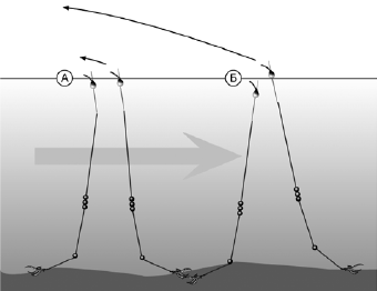 Для того чтобы ориентироваться, где находится крючок с приманкой, следует правильно, в зависимости от глубины и скорости течения подобрать оснастку. Соотношение диаметра лески с весом подпаска, который обычно составляет 1/3 от суммарного веса огрузки, должно быть таким, чтобы при касании дна поплавок чуть притапливался. В этом случае касание поверхности дна только крючком с приманкой будет фиксироваться как небольшое замедление проводки (перемещение поплавка относительно течения). В первом случае мы удилищем приподнимаем поплавок из воды (рис. 53, б) и затем продолжаем проводку до следующего его «притапливания». Во втором случае (рис. 53, а) достаточно лишь слегка придержать поплавок на месте, пока течение не снесет крючок с приманкой на длину поводка. Таким образом, периодически останавливая и отпуская снасть, мы добиваемся перемещения приманки непосредственно по дну.