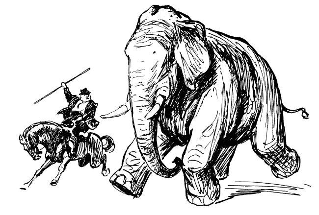 – Да это целая история! – сказал Иван Акимович. – Когда к нам привезли Шанго, он был молодым, непри-ручённым слоном. И вот в первую же ночь он сломал дверь слоновника, вырвался на волю, а потом разнёс ворота зоопарка и побежал по улицам города. Я тогда как раз дежурил в парке и помчался вдогонку. Взял первую попавшуюся лошадь, железную палку с острым наконечником. Перепугался, конечно. Представляете, что может наделать дикий разъярённый слон на улицах города! Догнал я Шанго почти в центре, когда за ним гнались и милиция, и пожарные. Бросил я палку с наконечником в слона. Она попала ему в ногу. Шанго споткнулся, упал. Потом вскочил и с испуга в ворота дома забежал. Тут мы общими усилиями и связали слона. Ну, доставили мы его обратно в зоопарк, промыли ранку на ноге. Она была, конечно, несерьёзная.