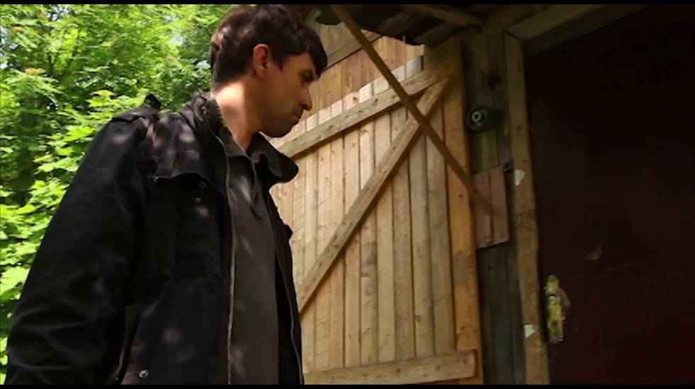 Харитонов, шатаясь, проходит по двору и останавливается на крыльце покосившегося от времени заброшенного деревянного дома с окнами, наглухо забитыми досками.