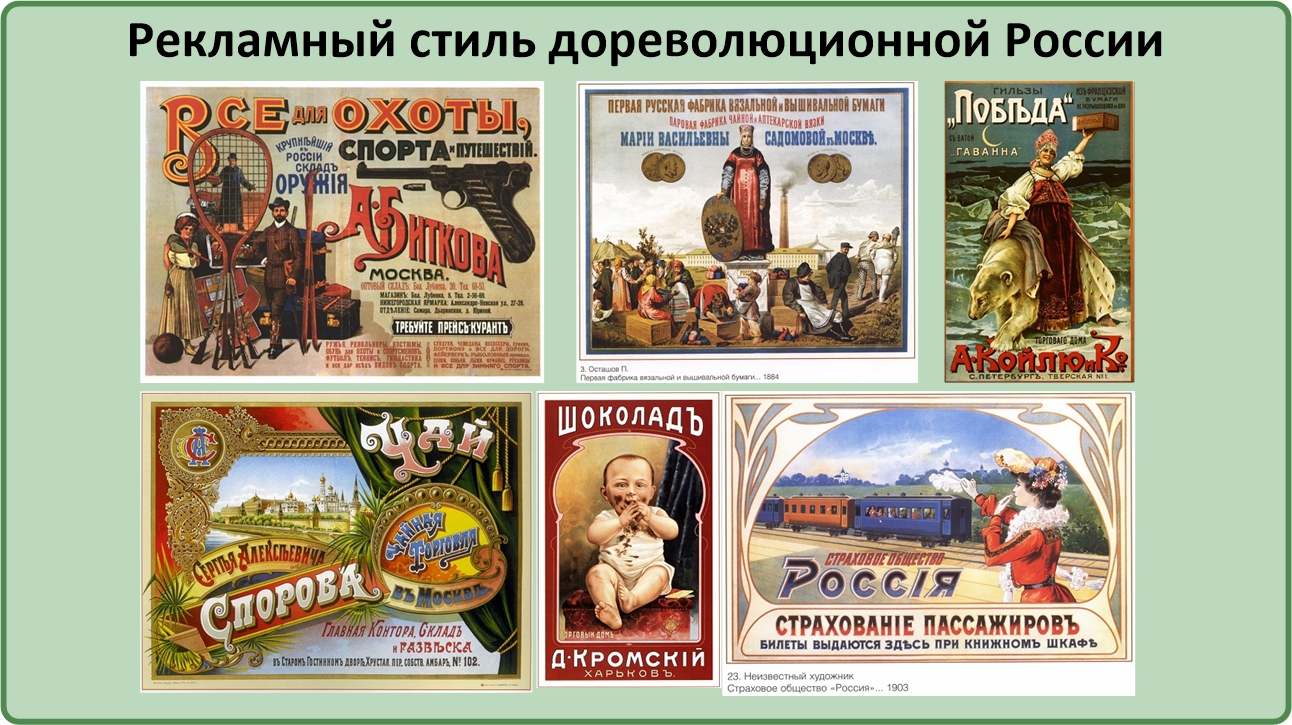 Постепенно рекламные методы распространились по всему христианскому миру. Рекламные объявления превратились из простых черно-белых текстов в превосходно оформленные произведения. Вот пример дореволюционных объявлений, выполненных в стиле русского модерна.