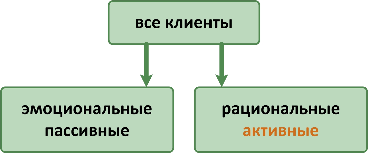 Неоднозначность коммуникаций заставляет вспомнить базовые принципы для описания клиентов. Любой человек, рассматриваемый как клиент, с психологической точки зрения может находиться в комбинации из двух статусов: (1) эмоциональный/пассивный, (2) рациональный/активный.