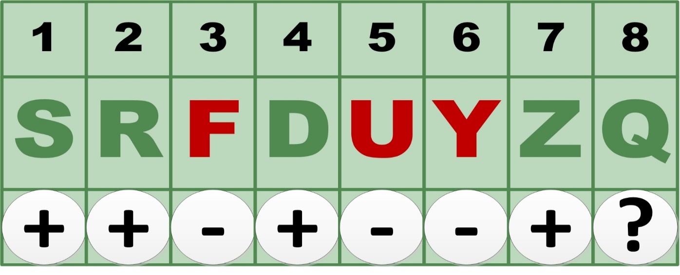 Следующий пример также связан с обучением, но объекты немного сложнее. На вход компьютера поступают наборы из 5 символов. Например, так может выглядеть один из наборов: