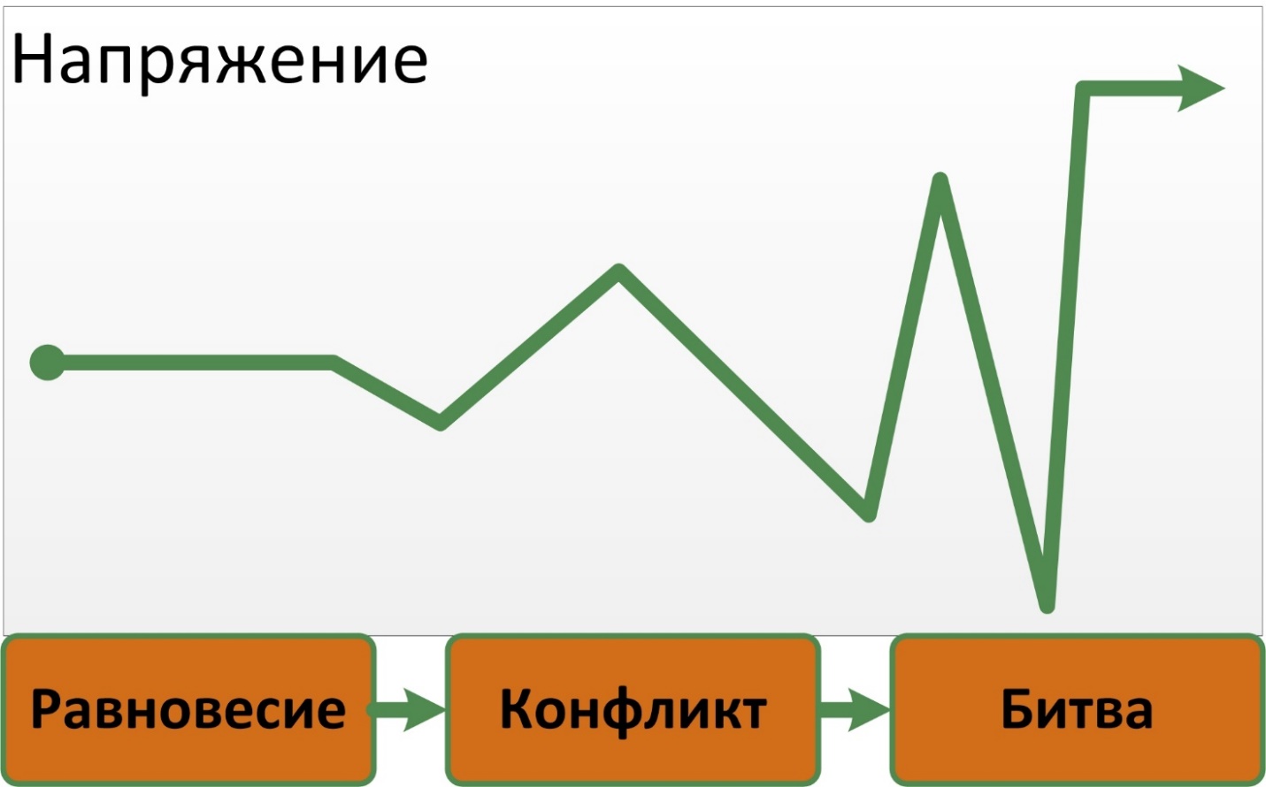 Этап 3. – Битва. Конфликт перерастает в битву. В течение битвы могут происходить несколько поворотных событий. Главный герой может кардинально менять представление о происходящем и свое видение окончания истории. Напряжение в истории также может несколько раз переходить из плюса в минус и обратно. Каждая смена сопровождается ростом напряжения, идет эскалация. Битва завершается кульминационным событием.