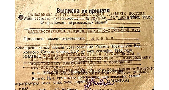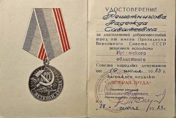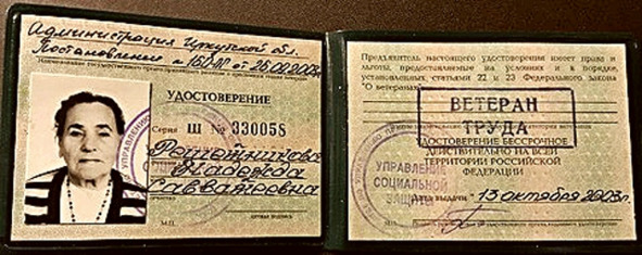 Затем переводом была принята на работу во врачебно-санитарную службу (НВС) на должность старшего инженера по кап. строительству, где проработала до пенсии. Выйдя на пенсию, работала в санатории «Изумруд» на рабочей должности, затем в китайском ресторане «Дракон» мойщицей посуды. Потом опять в службе НВС, только под фамилией моей внучки Шевченко Ольги – сотрудникам ВСЖД выделяют места в ведомственном детском садике, а правнуков уже двое народилось. Надо помогать. Работала и работаю в настоящее время курьером. (Напомню: эти строки писались в 2005 году). Ношу документы из одного здания в другое на 0,5 ставки санитарки уже 9-й год.