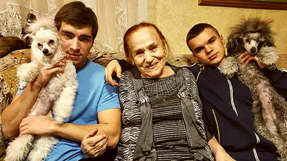 Баба Надя на своем 91 дне рождения (2016 год) с правнуками Алексеем (слева) и Сергеем; собачка Соня (слева) и собачка Стеша
