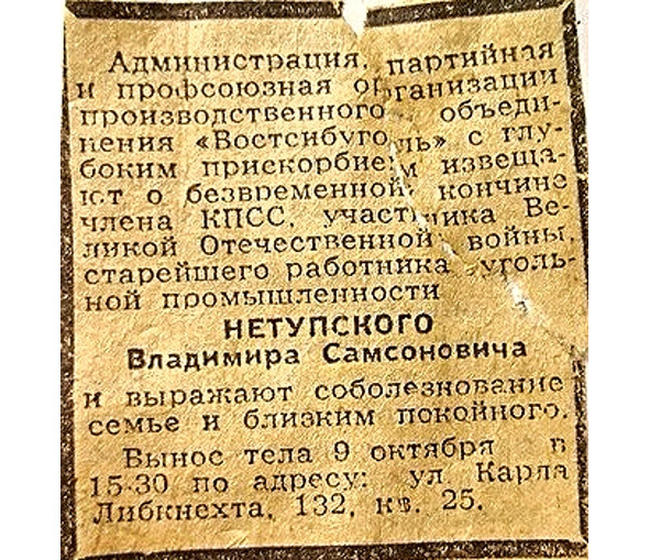 Дядю Володю Нетупского я неплохо знал. Работал он в шахтерском городе Черемхово инженером, а потом начальником разреза. А еще он фронтовик – младший лейтенант. В годы Великой Отечественной войны был разведчиком. Награжден Владимир Самсонович за проявленный героизм медалями: «За боевые заслуги» 12.07.1943 и медалью «За отвагу» 12.11.1943 года. Он бывал у нас в гостях. А его маму Анисью Никитичну я запомнил как жизнерадостную, оптимистичную и заботливую женщину. После смерти мужа она часто приходила к нам в гости, поскольку проживала в Иркутске.