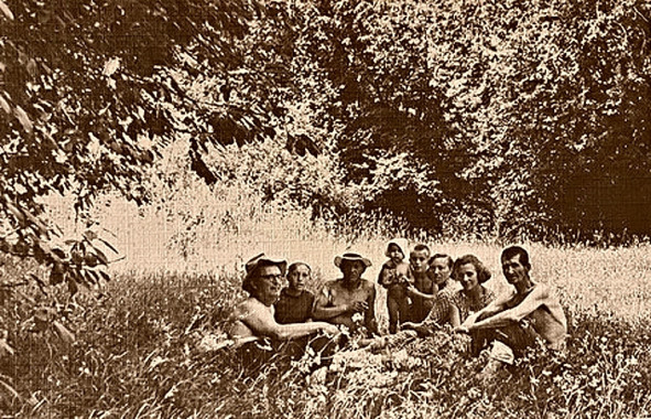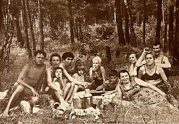 На природе. Слева направо. Юрий Иванович Никитин с женой Мэри, Саша и Света Щепины, Клавдия Ивановна Перлова (сестра бабы Веры) Савватей Захарович Щепин. Нижний ряд Ира Никитина, Жанна Щепина, Сережа Решетников (с ложкой) баба Вера и Моя мама – Надежда Решетникова.