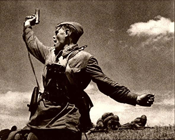 Младший политрук Алексей Еременко поднимает бойцов в атаку. Он погиб через несколько секунд после того, как был сделан снимок (фотография из интернета)