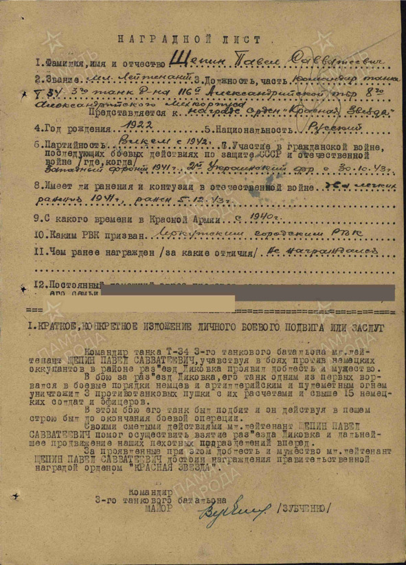 Шлю вам горячий курсантский привет. Это письмо от совершенно незнакомого человека. Я хочу рассказать нечто о вашем брате. Дело было весна наши части взломали оборону немцев и пошли вперед я по обстоятельствам остался позади и пошли осматривать недавнее поле боя был я и товарищ. Взорам нашим представилось следующее наш танк взгромоздился на легковую фрицевскую но и сам был подбит. Метров в 30 лежал молодой офицер танкист. Он был без шапки мягкие волосы обрамляли лоб. Глаза смотрели в небо, рядом была пачка писем, с которых я узнал его имя это и был ваш брат Щепин Павел. Запомнилась мне навеки Ваша открытка от 25/Хll я таскал почти полгода все не выпадало такого времени я там читал, что вы переписываетесь с некоторыми бойцами Не завяжем ли мы переписку во имя вашего брата.