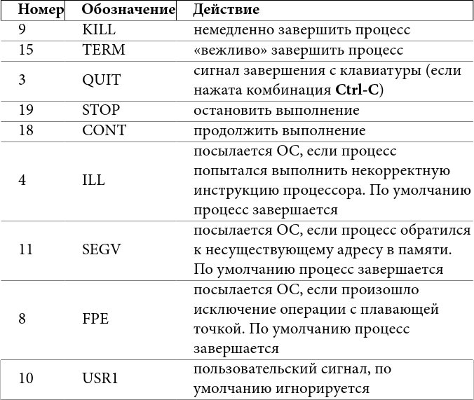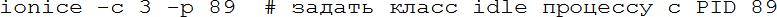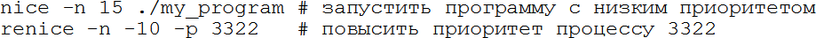 – сортировать процессы по использованию процессора; 1 – показывать загрузку каждого ядра или суммарную; k – послать сигнал процессу; r – изменить приоритет процесса; u – фильтровать по пользователю; q – выход. У htop более дружественный интерфейс, по возможности она использует цветной вывод, загрузку процессора и памяти выводит в виде текстовых прогресс-баров, умеет организовывать процессы в деревья (и схлопывать их с одну строку, что иногда очень удобно). Клавиши управления выведены в нижней строке в стиле Norton Commander (Midnight Commander/FAR manager). Мы уже не раз упомянули сигналы – это простой способ общения процессов, любой процесс может послать другому сигнал, если он принадлежит тому же пользователю (пользователь root может посылать всем). Сигнал – целое число, так что много информации им не передать, но его функция – попросить процесс выполнить какое-то действие. Все сигналы, кроме KILL, могут быть перехвачены и обработаны, если процесс не обрабатывает сигнал, то ОС выполняет заранее определённое действие за него. Для большинства сигналов есть стандартные значения и действия, ниже – самые часто используемые: Таблица 3: некоторые сигналы в Linux Действия «по умолчанию» процесс может изменять (кроме сигнала KILL). Их можно обработать или игнорировать. При корректном завершении память процесса может быть записана в т. н. core-файл для того, чтобы после можно было исследовать причину ошибки отладчиком. Будет ли создан core-файл, определяется настройками ОС и лимитами (см. главу о квотах). Послать сигнал из командной строки можно командой kill. Например, kill -9 1234 принудительно завершит процесс 1234, а kill -STOP 2345 остановит процесс 2345. Как видно, можно использовать как номер сигнала, так и его обозначение. kill -l покажет список всех сигналов. Иногда требуется послать сигнал не одному процессу, а многим, например всем процессам пользователя. Тогда на помощь приходит программа pkill: pkill -u vasya -TERM пошлёт сигнал TERM всем процессам пользователя vasya. Выше мы говорили о том, что процессы, желающие выполняться, ставятся в очередь. В ней они выполняются не всегда подряд, у каждого есть приоритет и влияющий на него параметр nice (вежливость). Чем выше приоритет, тем быстрее процесс продвигается к началу очереди. Явно задать приоритет нельзя, но можно поменять вежливость (часто её тоже называют приоритетом для простоты, но это не совсем так). Делается это командой nice или renice, первая запускает программу с заданным приоритетом, вторая меняет приоритет уже запущенной. Чем выше вежливость, тем ниже приоритет, программа чаще будет «пропускать» других вперёд. Исторически вежливость меняется от 20 до +20, и обычный пользователь не может указать её меньше 0. Например: Здесь мы меняем вежливость с 0 до 15 (приоритет понижается) или до -10 (приоритет повышается). Кроме очереди на ресурсы процессора есть очередь к ресурсам жёстких дисков, несколько процессов могут одновременно читать-писать, и их запросы будут конкурировать. В этой очереди тоже есть приоритет, им управляет команда ionice. Есть три класса приоритетов – idle (выполнять запрос, если больше никого в очереди нет), best effort (нормальная очередь) и real time (запрос должен быть выполнен за заданное время). Внутри классов, кроме idle, есть собственные приоритеты, но в наших задачах можно ограничиться назначением класса idle процессу, занимающему много времени на дис