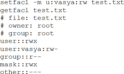 Другое расширение, как правило требующее активации на файловой системе, – ACL (Access Control List), списки контроля доступа. Посмотреть и изменить их можно командами getfacl и setfacl. Они работают аналогично традиционным правам доступа, рассмотренным выше, однако права на чтение/запись/исполнение теперь можно устанавливать отдельным пользователям и/или группам, а также ограничивать эти права маской. Маска – набор «максимальных» прав из правил acl (традиционные к ним не относятся), которые будут работать. Например, разрешим пользователю vasya чтение файла и запись в файл test.txt: