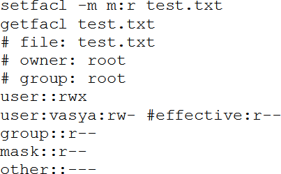 Здесь ключ '-m' указывает модифицировать правила acl. Указав ключ '--set', можно заменить правила, т. е. удалить старые и заменить новыми (в setfacl можно указать несколько правил одновременно). Ключом '-x' правила можно удалять. Строка 'u:vasya;rw' указывает на то, что правило относится к пользователю (u = user, g = group, o = others), его и<я vasya, и устанавливаются права на чтение и запись. Теперь установим маску – разрешим пользователю vasya (и другим, имеющим доступ через правила acl) «не более чем» чтение: