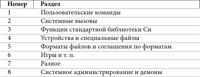 Самая главная команда, которая вам потребуется, – man. Её имя происходит совсем не от английского «человек» (man), а от «руководство, учебник» (manual). Это – основной источник справочной информации по командам, пакетам и многому другому в UNIX и Linux. Вся информация в man разделена по разделам, исторически им присвоены номера. Как правило, для получения справки по какой-то команде достаточно набрать man имя_команды. Man найдёт первую страницу с заданным именем и отобразит её.