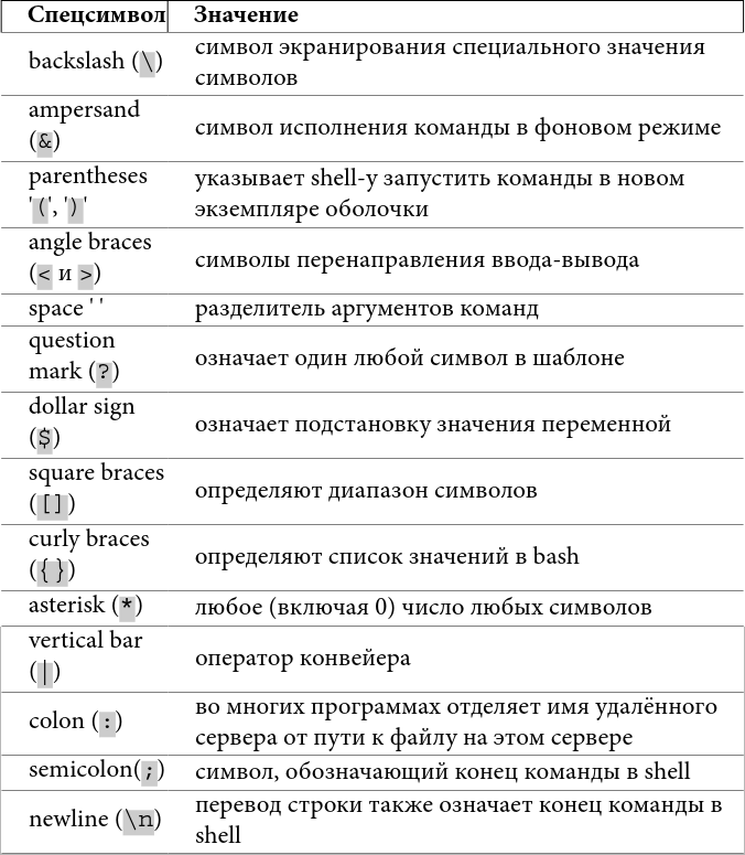 В именах файлов и каталогов можно использовать любые символы, кроме '/' и '\0'. Одним из самых распространённых средств работы для UNIX является оболочка – shell. В shell некоторые символы имеют специальное значение (которое можно отменить) – это облегчает работу с файлами. Ниже приведён список спецсимволов shell: