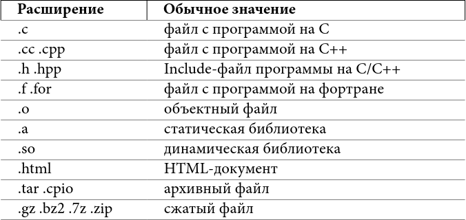Расширение файла – часть имени после последней точки; например, файл 'text.cc' имеет расширение '.cc'. Для большинства программ расширение не имеет принципиального значения, но его наличие облегчает понимание назначения файла. Ниже – наиболее часто встречающиеся расширения: