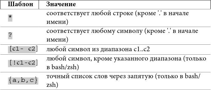 Например, 'ls *.{cxx,h,la}' превратится в ls *.cxx *.h *.la. Более интересный приём – 'cp config{,.bak}', который превратится в cp config config.bak. Второй файл не существует, он явно задан шаблоном.