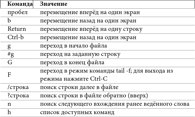 Команда less содержит большой набор внутренних команд для перемещения по файлу, поиска контекста и даже редактирования: