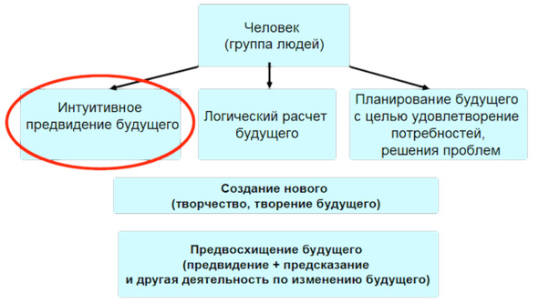 Предвидение является формой опережающего отражения действительности, представленной благодаря интуиции в сознании предрасположенной и готовой к подобному восприятию личности в виде визуального, звукового или иного образа, и направленной на постижение явлений, которые отсутствуют или не известны в настоящий момент, но могут возникнуть или быть изучены и открыты в будущем.