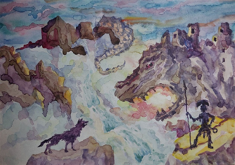 Рисунок автора этой книги иллюстрирует эпизод из мифа Вала. На переднем плане показан диалог, происходящий между собакой Сарамой и Пани у пограничной реки Раса.