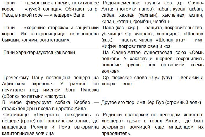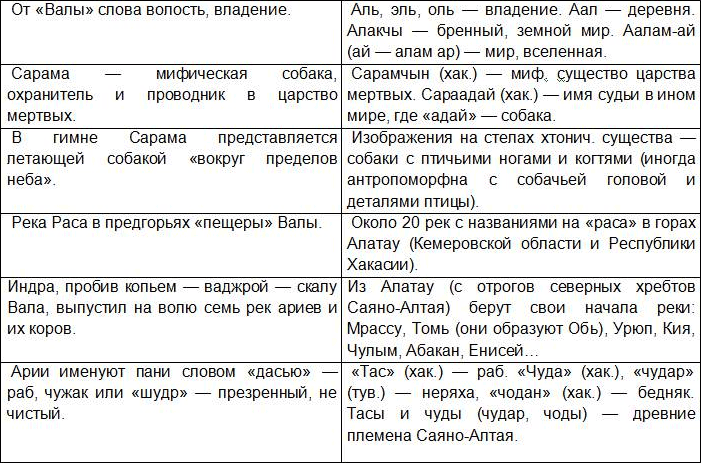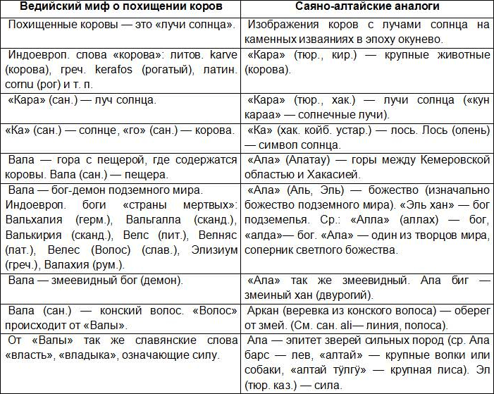 Сравнительная таблица между ведийским мифом о похищении коров и его саяно-алтайскими аналогами.