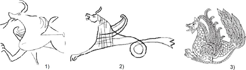 <…> Что касается сущности чудовищного зверя-пожирателя, то в основе его лежит, скорее всего, образ хищного волка или волчицы. Полные изображения этого существа четырежды обнаружены на тазминских стелах и писаницах.