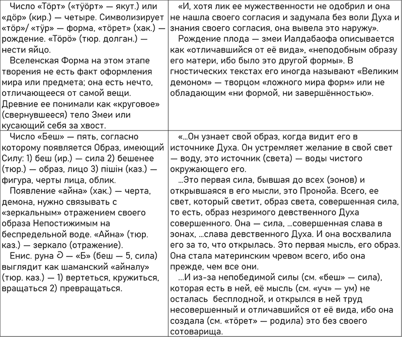 Только в случае гностиков-офитов Высший мир сибирских змеепоклонников представлен как неописуемое Единое, познающее самого себя через свои части – эоны. Мы рассмотрим лишь кратко в виде сравнительной таблицы самые существенные характеристики мистического знания людей-змей.