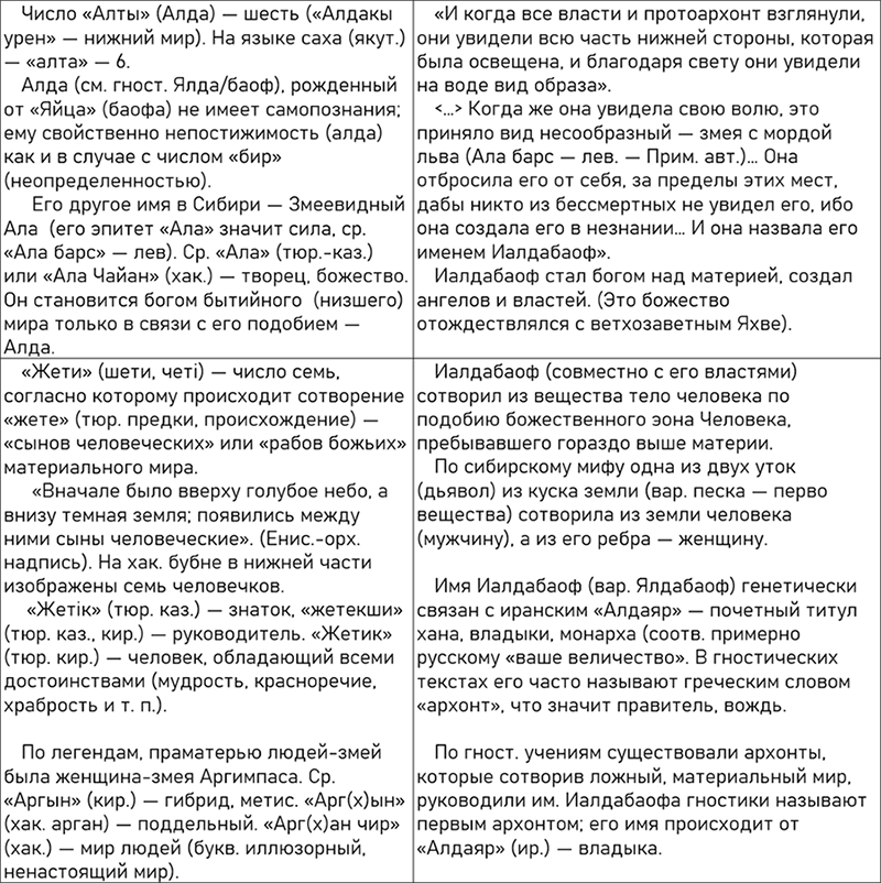 Многие совпадения и заимствования, приведенные в этих двух таблицах, служат серьезным аргументом в пользу того, что родину древних знаний гностиков – офитов (змеепоклонников) нужно искать не в Средиземноморье или в Передней Азии (у шумеров и вавилонян), а на юге Западной Сибири. Более глубокий анализ о числах, на которых покоится «научный» пан Сибири, мы рассмотрим ниже.