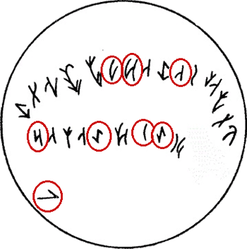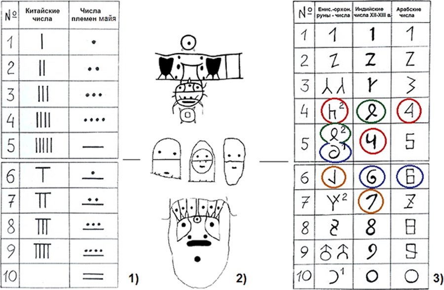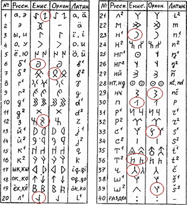 При внимательном рассмотрении таблиц, можно заметить некоторые соответствия графических букв енисейско-орхонской письменности арабским цифрам. (Порядковые номера этапа творения мира).