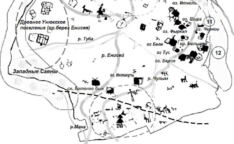 Эти древнейшие образы из «каменной» карты отчетливо прослеживаются в мифологии и фольклоре индоевропейских народов. Не потому ли окуневские картографы – паны на карте решили изобразить солнечного оленя и старика меньших размеров относительно их «горно-речных» богов верхнего и среднего миров. Впрочем, это касается всех петроглифов «нижнего» мира, где люди и животные теряются среди впечатляющих личин – богов пани. Конечно же, на карте окуневские божества и люди заняли более высокое положение по сравнению с низшим рангом андроновских богов и степных индоевропейских общин. В этой обители только андроновский Индер (Индра) выделяется своим более крупным (антропоморфным) размером.