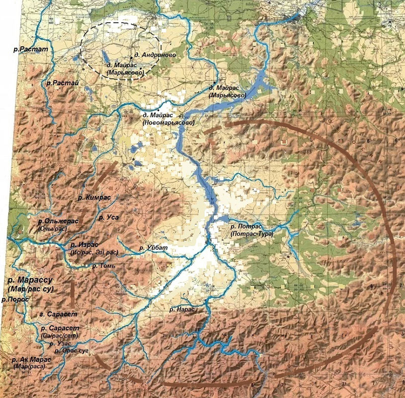 Формант «рас» встречается в ряде названий рек: Кимрас, Ольжерас, Растай, Симрас, Ростат, Израс, Кяраса, Ак Марас (гл. исток Мрассу) и т. д. Простое перечисление таких слов потребует пространного исследования и изложения, мы же вынуждены ограничиться здесь указанием нескольких категорий таких слов.