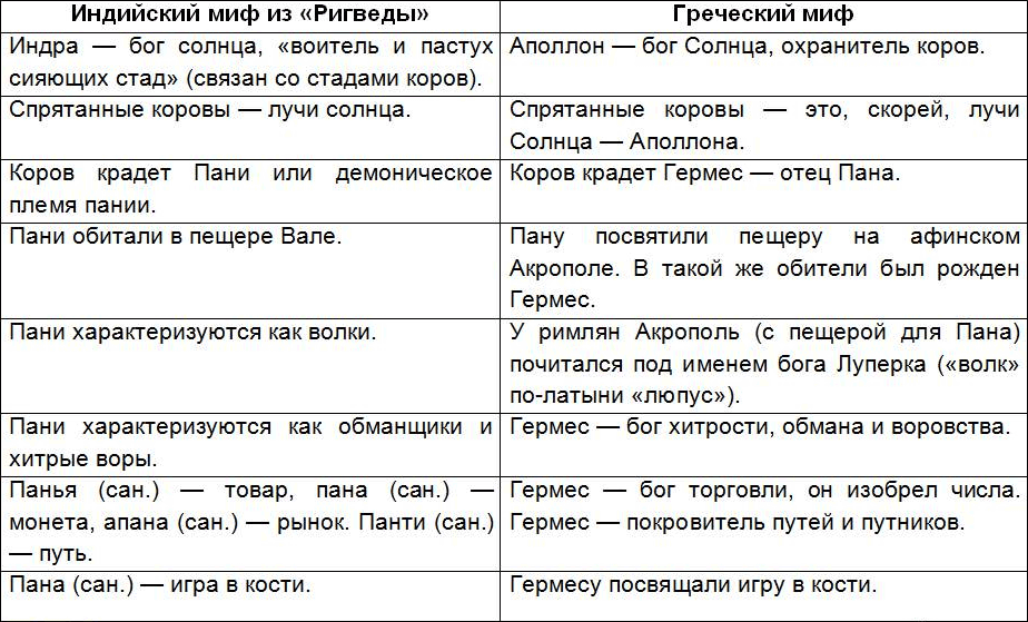 Составим сравнительную таблицу между индийским и греческим мифами, которая поможет понять не только общие сюжеты для индоевропейских народов, но и возможные истоки их происхождения.