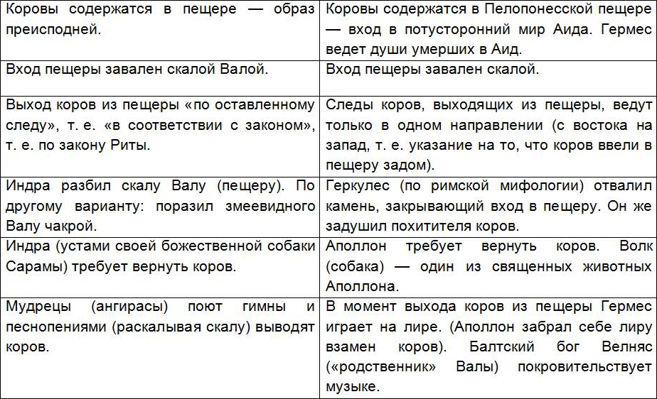 Сравнительная таблица показывает общий для индоевропейских народов сюжет. Миф об Аполлоне близок по сюжету ведийскому мифу о боге Индре и его коровах. Сюжеты обоих мифов, в принципе, аналогичны и должны быть связаны, скорей всего, с культурой андроновских племен. Идет ли здесь речь о заимствовании греками индийского мифа или наоборот, определить сложно. Трудность заключается в выявлении первоисточника мифа.