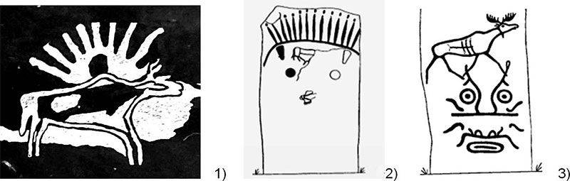 Рис. 9. «Лучи света» в петроглифах Древней Хакасии: солнечные коровы 1), 2) и небесная лось 3).