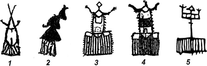 В рисунках сибирских двух-, трехъярусных срубов на столбах (см. рис. 8, 1–5) не трудно увидеть руки женского божества, задранные кверху. Скифы называли ее Апи или Аргимпаса (Артимпаша) и изображали в виде змееногой богини с поднятыми руками. Возможно, имя змеевидной богини Аргым/паша (помесь человека и змеи) происходит от «аргын» (тюр. кир.) – помесь, гибрид (метис) и «пас» (тюр.) – голова, глава, предводитель. Ср. также «аргын» (хак.) – искусственный, нечистокровный (помесь) или «пашу» (сан.) – крупный рогатый скот.
