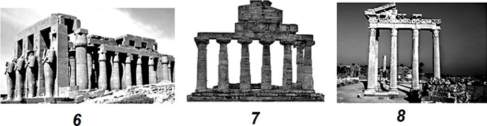 6 – колонны храма Рамзеса в Луксоре, Египет (XV в. до н. э.); 7 – дорические колонны храма Геры в Пестуме, Древняя Греция (V в. до н. э.); 8 – колонны храма Древнего Рима.