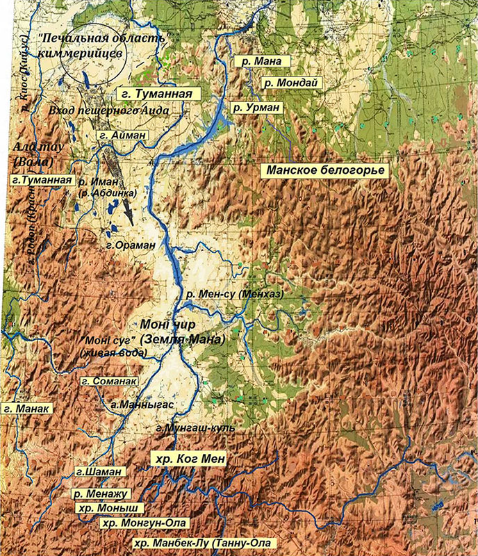 Повторимся, страна Мöнi (Ман/Мен) соответствует современной территории Хакасии, так как есть система гор и рек, как «Ког/менские» (Небесный Мен), Манский хребет, река Ман и т. д. Кöг Мен жир (по др. тюр. письменности) – Киргизская страна. Автором насчитано на северной части Саяно-Алтае около сорока гор и перевалов на «Ман» / «Мен» / «Мун». Приведем некоторые из названий гор: Мундарга (Манский Хребет) в Хакасии, Ког мен (небесный Мен) – Западные Саяны или долина р. Абакана (Хак-Минус. котловина), Манбек-лу (по Гардизи) по названию Монгун-Ола, мифическая гора Манак по р. Мрассу и т. д. Также имеется около двадцати пяти рек и озер на «Ман» / «Мен» / «Мун». Это такие реки: Манхаз (по Аль Идриси) или Мен су (Минуса), Мана (Красноярский край) и т. д. Подробнее о более раннем прообразе «манской» пещеры, где содержатся народом пани мифические коровы, мы обсудим ниже.